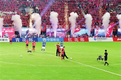 晚上7時(shí)許,在主持人的熱烈開場(chǎng)白中,激光秀、無人機(jī)展演《雙城情一家親》、歌舞《相親相愛一家人》等精彩節(jié)目陸續(xù)上演,讓現(xiàn)場(chǎng)觀眾直呼“值回票價(jià)”!在一片歡呼聲中,身著深藍(lán)色戰(zhàn)袍的德陽重裝隊(duì)、身披紅色戰(zhàn)衣的綿陽九洲長虹隊(duì)球員陸續(xù)亮相。