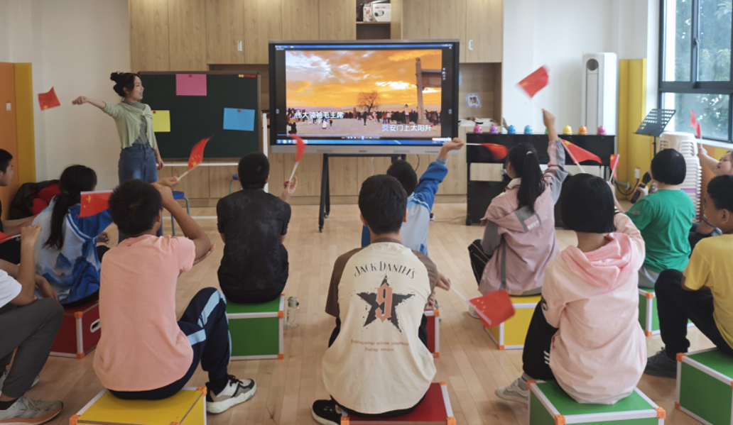 隨后,各班開(kāi)展“共慶祖國(guó)華誕”主題班會(huì)。通過(guò)講述愛(ài)國(guó)故事、播放紅色影視片段等形式,讓學(xué)生感受祖國(guó)的歷史與榮光。學(xué)生們用手勢(shì)、畫作和簡(jiǎn)單詞匯表達(dá)對(duì)祖國(guó)的認(rèn)識(shí)與情感,“天安門”“五星紅旗”成為他們心中祖國(guó)的象征。