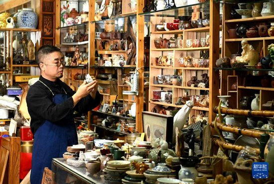 10月11日,在位于河北省石家莊市橋西區(qū)的工作室內(nèi),李軍航在檢查殘破瓷器情況。