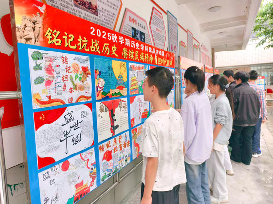 作品完成后,歷史組老師們利用休息時間,對優(yōu)秀作品進行了篩選和整理,并精心設(shè)計、布置了專題展板。展板一經(jīng)展出便吸引了眾多師生駐足觀看。課間時分,同學(xué)們或凝神細(xì)讀,或低聲交流,在一筆一畫、一文一圖中感受歷史的厚重與民族的堅韌。這道獨特的“風(fēng)景線”,不僅美化了校園環(huán)境,更營造了“時時受教育,處處受熏陶”的濃厚學(xué)習(xí)氛圍,讓歷史知識“活”了起來,讓民族精神“立”了起來。