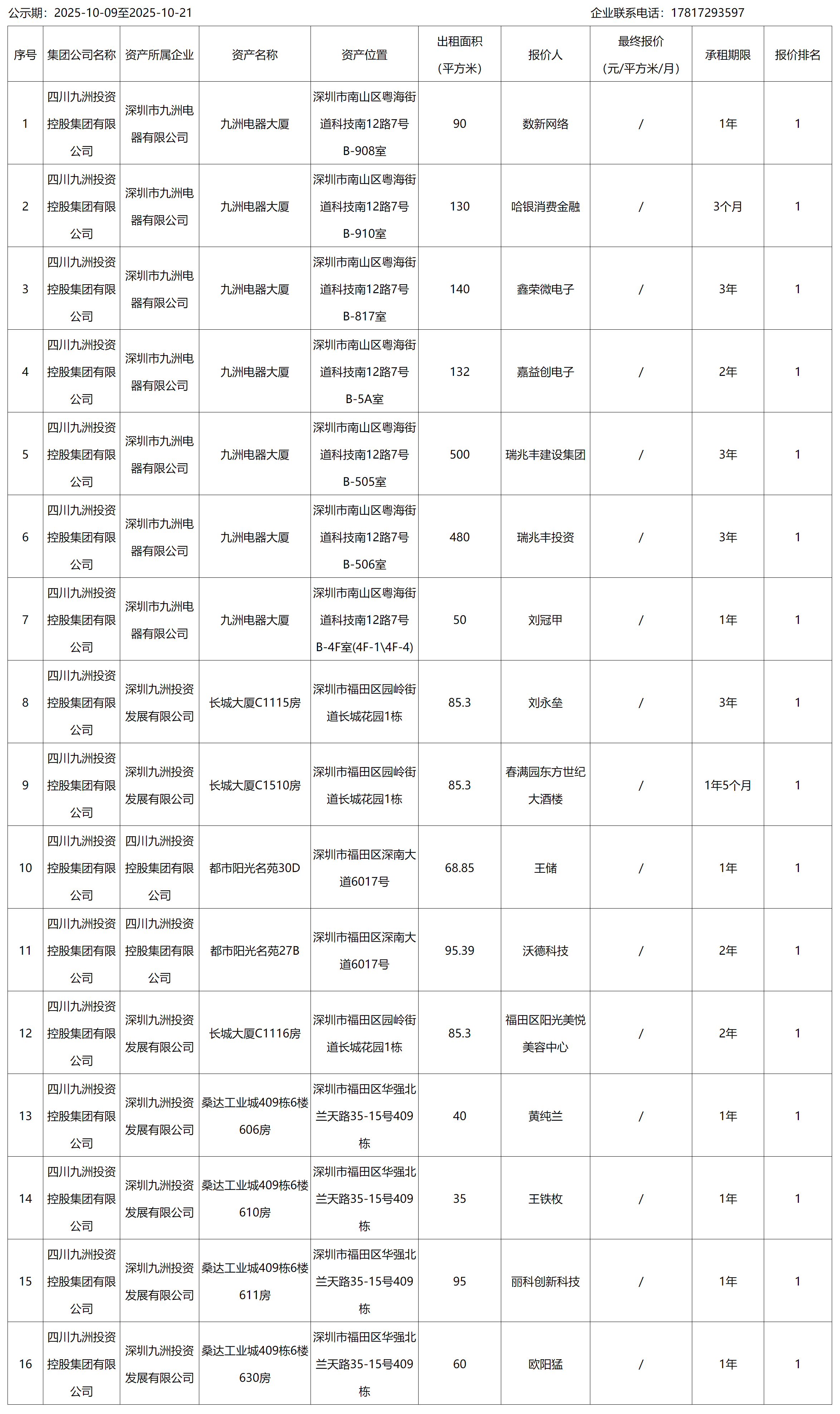 深圳市九洲光電子有限公司代管房產(chǎn)九洲電器大廈、長(zhǎng)城大廈、都市陽(yáng)光名苑、桑達(dá)409棟出租結(jié)果公示