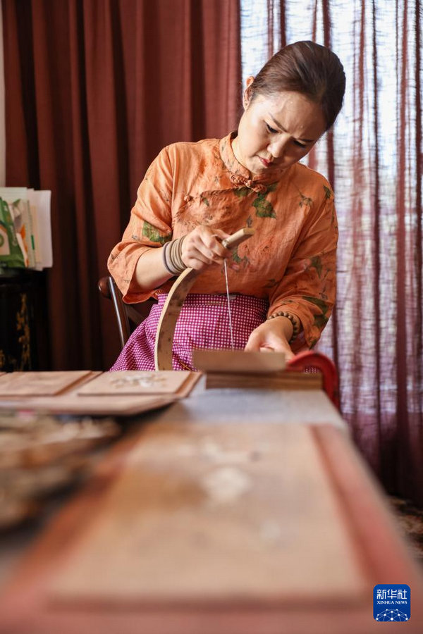 10月15日,胡蓉在孔浦街道怡江社區(qū)的非遺工作室內(nèi)展示骨木鑲嵌技藝。