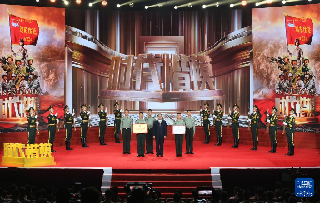 在“時(shí)代楷模”發(fā)布儀式上,陸軍某合成旅合成二營(yíng)裝甲步兵一連(“劉老莊連”)官兵代表領(lǐng)取“時(shí)代楷模”獎(jiǎng)牌和證書(9月29日攝)。新華社記者 張永進(jìn) 攝