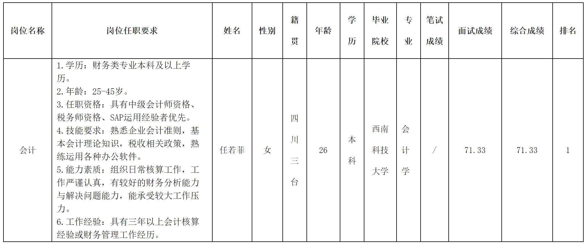 根據(jù)四川長虹國際酒店有限責任公司發(fā)布的招聘公告及招聘相關(guān)規(guī)定,經(jīng)面試等程序,現(xiàn)將測試成績予以公示。