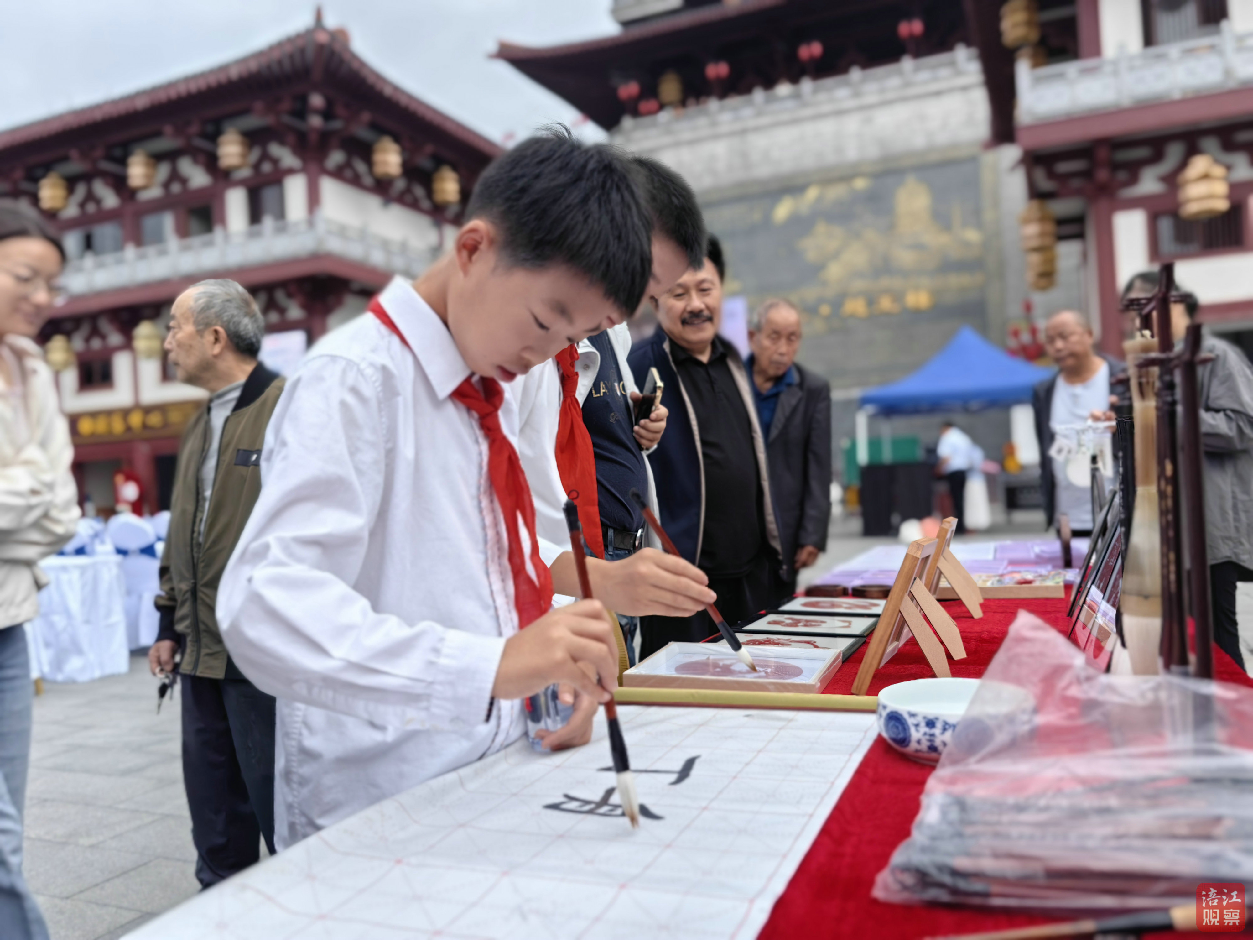 2025天府書展綿陽分展場啟動儀式現(xiàn)場,小朋友體驗(yàn)毛筆書寫