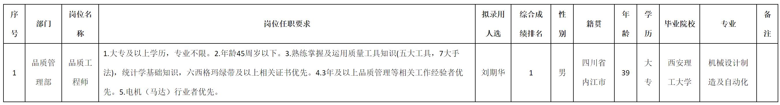 根據(jù)四川安和精密電子電器股份有限公司發(fā)布的招聘公告及招聘相關(guān)規(guī)定,經(jīng)測試、考察、體檢等程序,擬錄用劉期華同志到四川安和精密電子電器股份有限公司工作,現(xiàn)予以公示,具體情況如下: