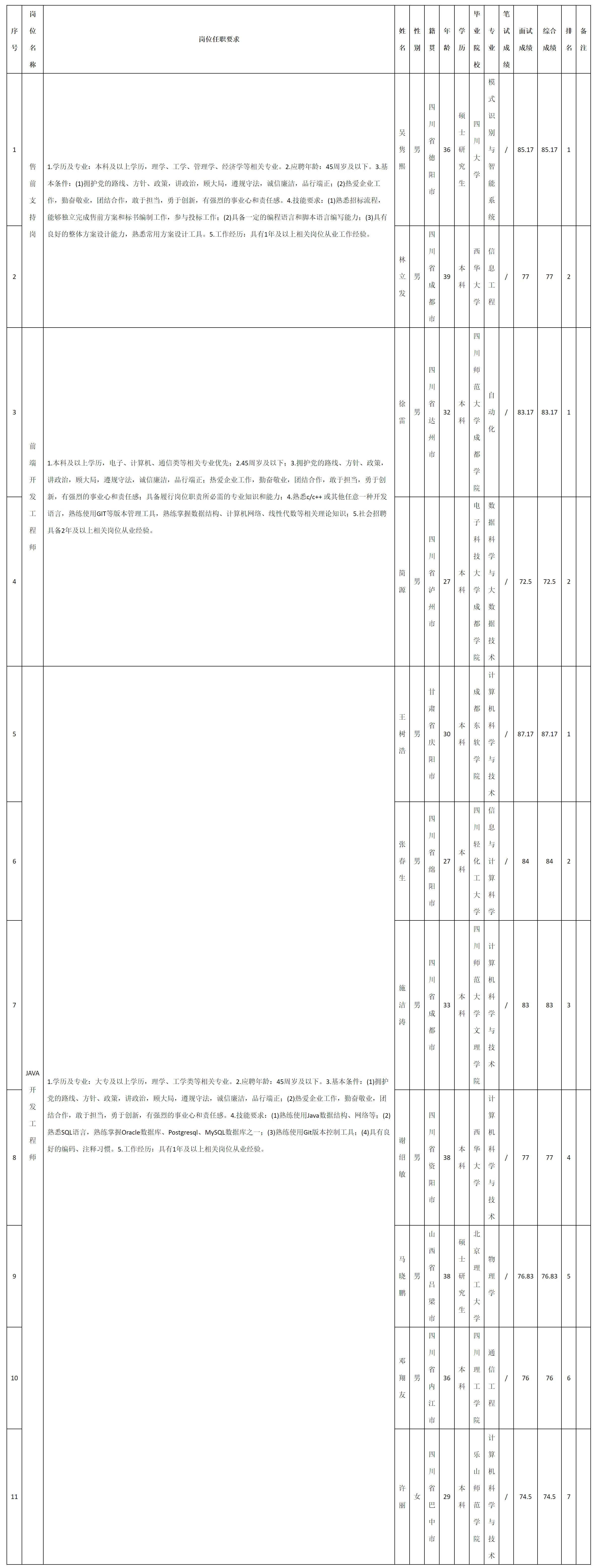 根據(jù)四川九強(qiáng)通信科技有限公司發(fā)布的招聘公告及招聘相關(guān)規(guī)定,現(xiàn)將測試成績予以公示。