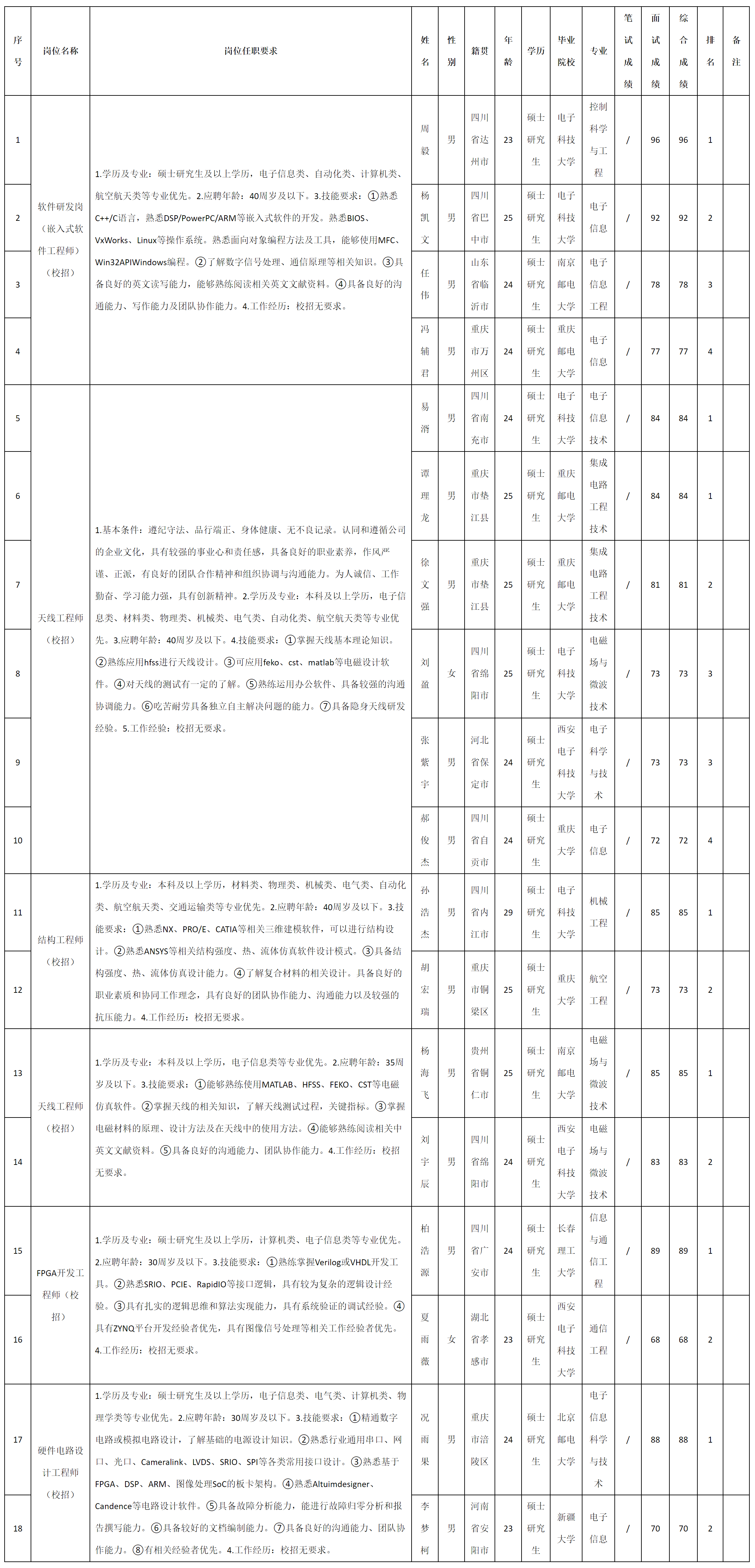 根據(jù)四川九洲電器集團有限責任公司發(fā)布的招聘公告及招聘相關(guān)規(guī)定,現(xiàn)將測試成績予以公示。