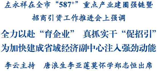 左永祥在講話中指出,今年以來,我們把推進重點產業(yè)建圈強鏈作為以科技創(chuàng)新引領產業(yè)創(chuàng)新、加快發(fā)展新質生產力、扎實推進高質量發(fā)展的重要著力點和突破口,把產業(yè)建圈強鏈行動作為“八大行動”之一擺在重要位置來抓,推動工作機制和推進模式不斷完善,圍繞產業(yè)鏈招商引資工作取得了積極進展,相關工作開局有力、起勢良好。全市上下要保持發(fā)展定力,創(chuàng)新思路舉措,以建圈強鏈為引領、“587+”產業(yè)體系為方向,以“拼”的姿態(tài)、“實”的作風,抓緊抓實招商引資工作,持續(xù)強鏈主、聚鏈屬、延鏈條,不斷提升我市現(xiàn)代化產業(yè)體系發(fā)展能級和水平。