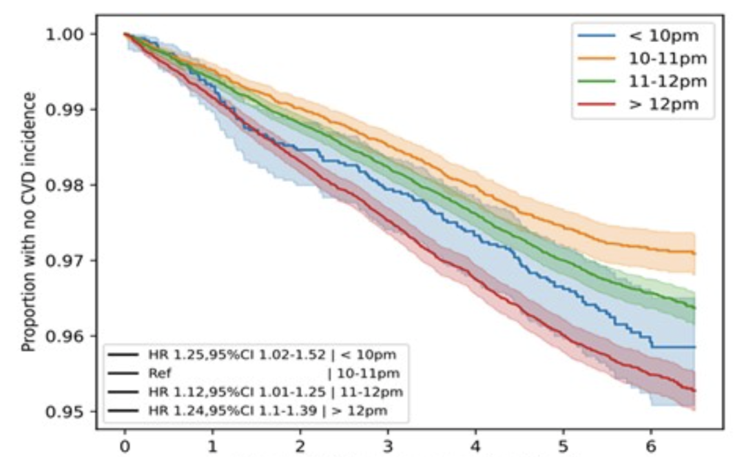 研究人員把這些人分成四組:晚上 10:00 前入睡、晚上 10:00~10:59 入睡、晚上 11:00~11:59 入睡和午夜后才入睡。然后,他們對參與者進行了平均 5.7 年的隨訪,統(tǒng)計誰在這段時間里新發(fā)了心血管疾病(如心梗、中風、心衰等)。