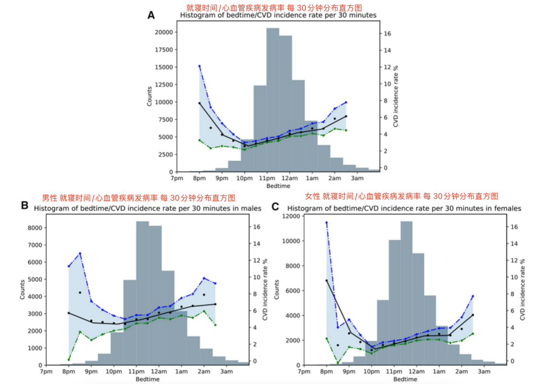 睡眠開始時間與心血管疾病發(fā)病率之間的關系,(A)總體樣本,(B)男性,(C)女性,圖源:參考文獻 [1]