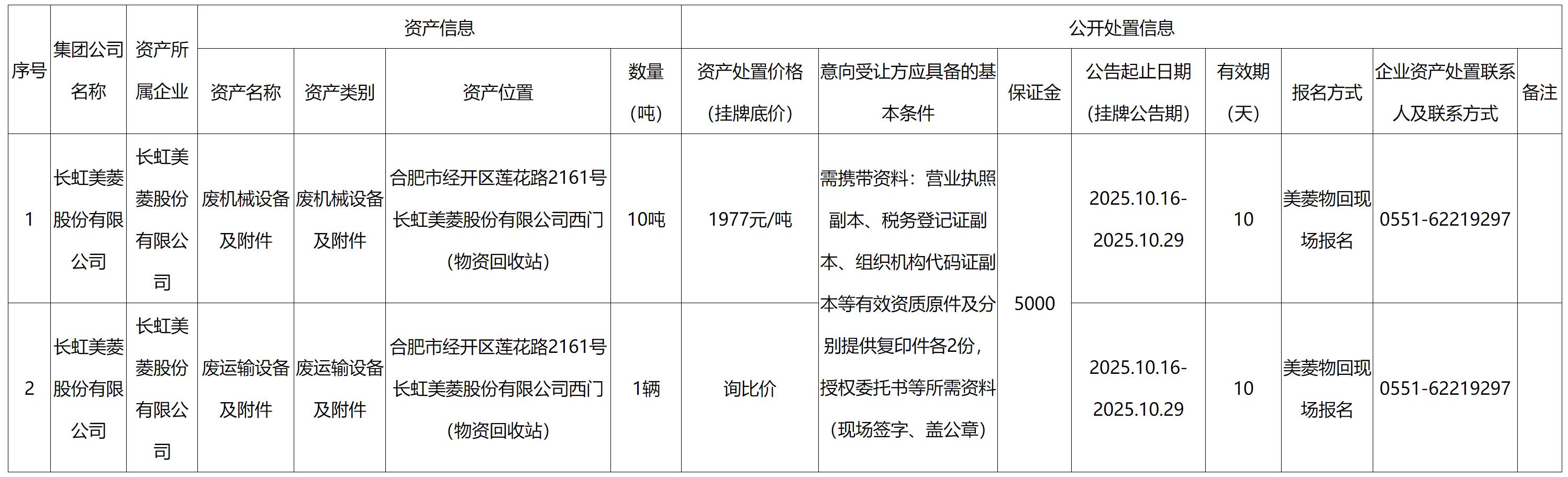長虹美菱股份有限公司資產(chǎn)處置公告