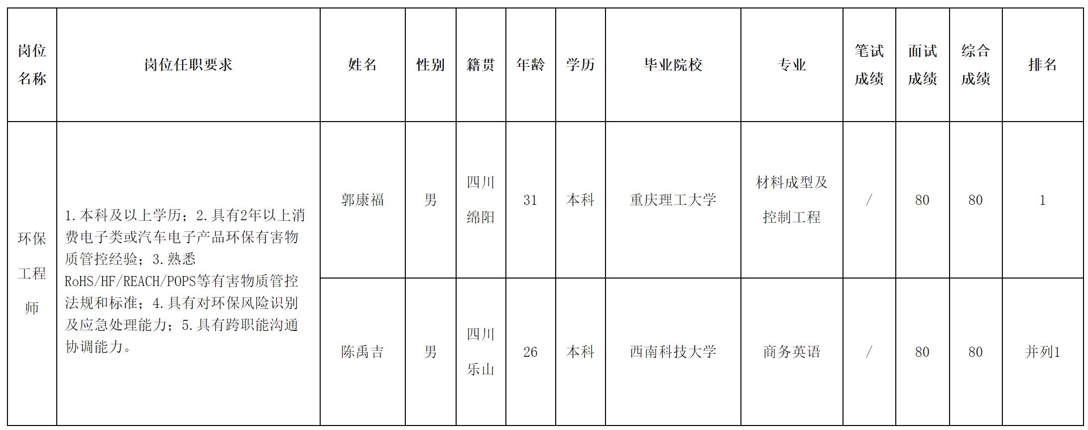 根據(jù)四川華豐科技股份有限公司發(fā)布的招聘公告及招聘相關(guān)規(guī)定,經(jīng)筆試、面試等程序,現(xiàn)將測試成績予以公示。