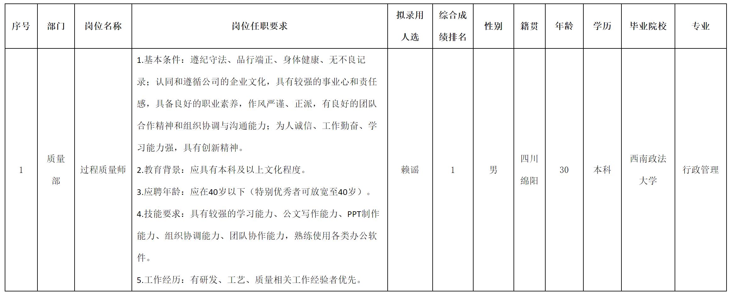 根據(jù)四川長虹空調(diào)有限公司發(fā)布的招聘公告及招聘相關(guān)規(guī)定,經(jīng)面試,擬錄用賴謠到長虹空調(diào)工作,現(xiàn)予以公示,具體情況如下:
