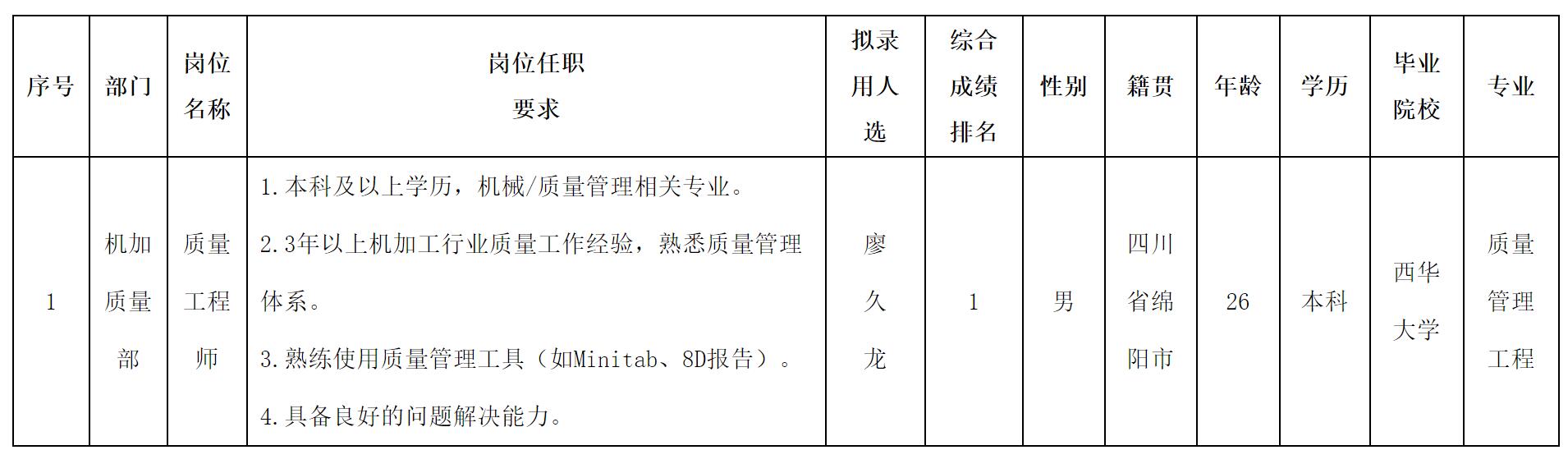 根據(jù)四川波鴻實業(yè)有限公司發(fā)布的招聘公告及招聘相關規(guī)定,經(jīng)面試、體檢等程序,擬錄用廖久龍同志到威斯卡特(綿陽)汽車零部件制造有限公司工作,現(xiàn)予以公示,具體情況如下: