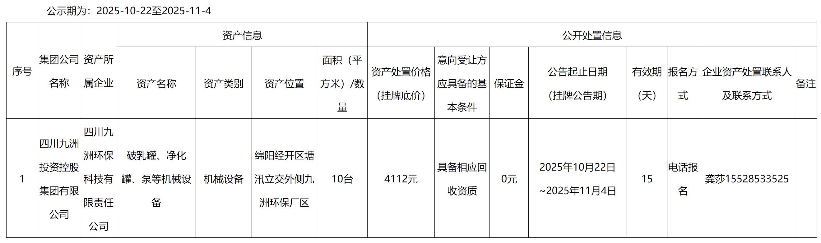 四川九洲環(huán)??萍加邢挢熑喂酒迫楣蕖艋?、泵等機械設備資產(chǎn)處置公告