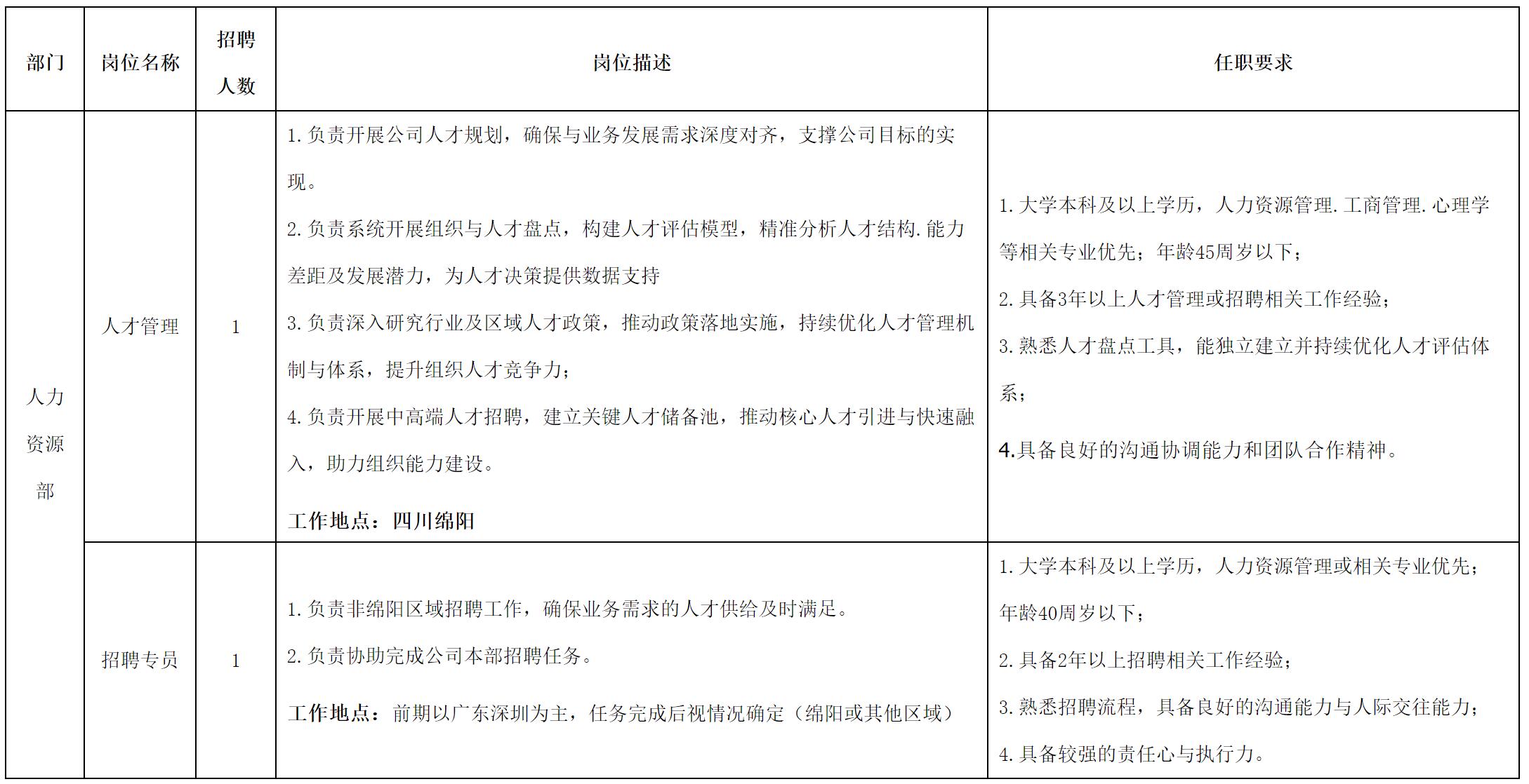 現(xiàn)因公司經(jīng)營發(fā)展需要,現(xiàn)面向長虹控股集團(tuán)內(nèi).外部誠聘人才管理等崗位人員,具體崗位招聘信息公告如下: