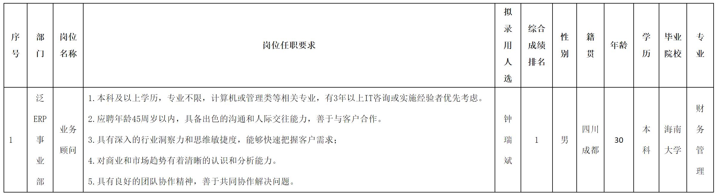 根據(jù)四川虹信軟件股份有限公司發(fā)布的招聘公告及招聘相關(guān)規(guī)定,經(jīng)測試、考察、體檢等程序,擬錄用鐘瑞斌同志到四川虹信軟件股份有限公司工作,現(xiàn)予以公示,具體情況如下: