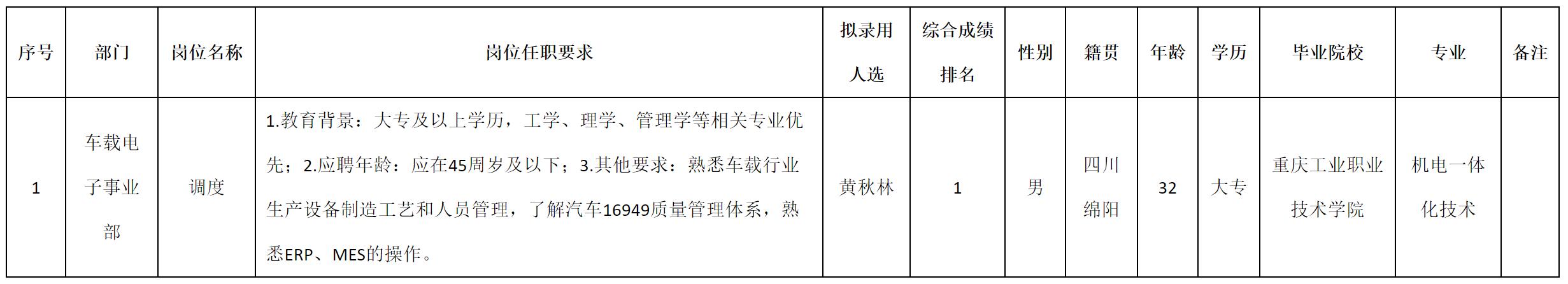 根據(jù)四川九州電子科技股份有限公司發(fā)布的招聘公告及招聘相關(guān)規(guī)定,經(jīng)測(cè)試、考察、體檢等程序,擬錄用黃秋林同志到四川九州電子科技股份有限公司工作,現(xiàn)予以公示,具體情況如下: