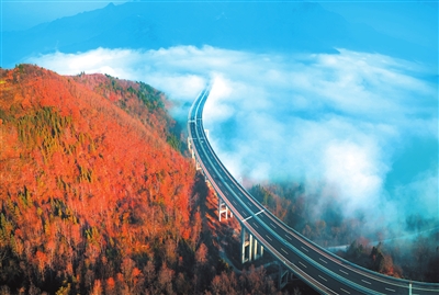 九綿高速沿線層林盡染,如同一幅絢爛的油畫。 胡宇 攝