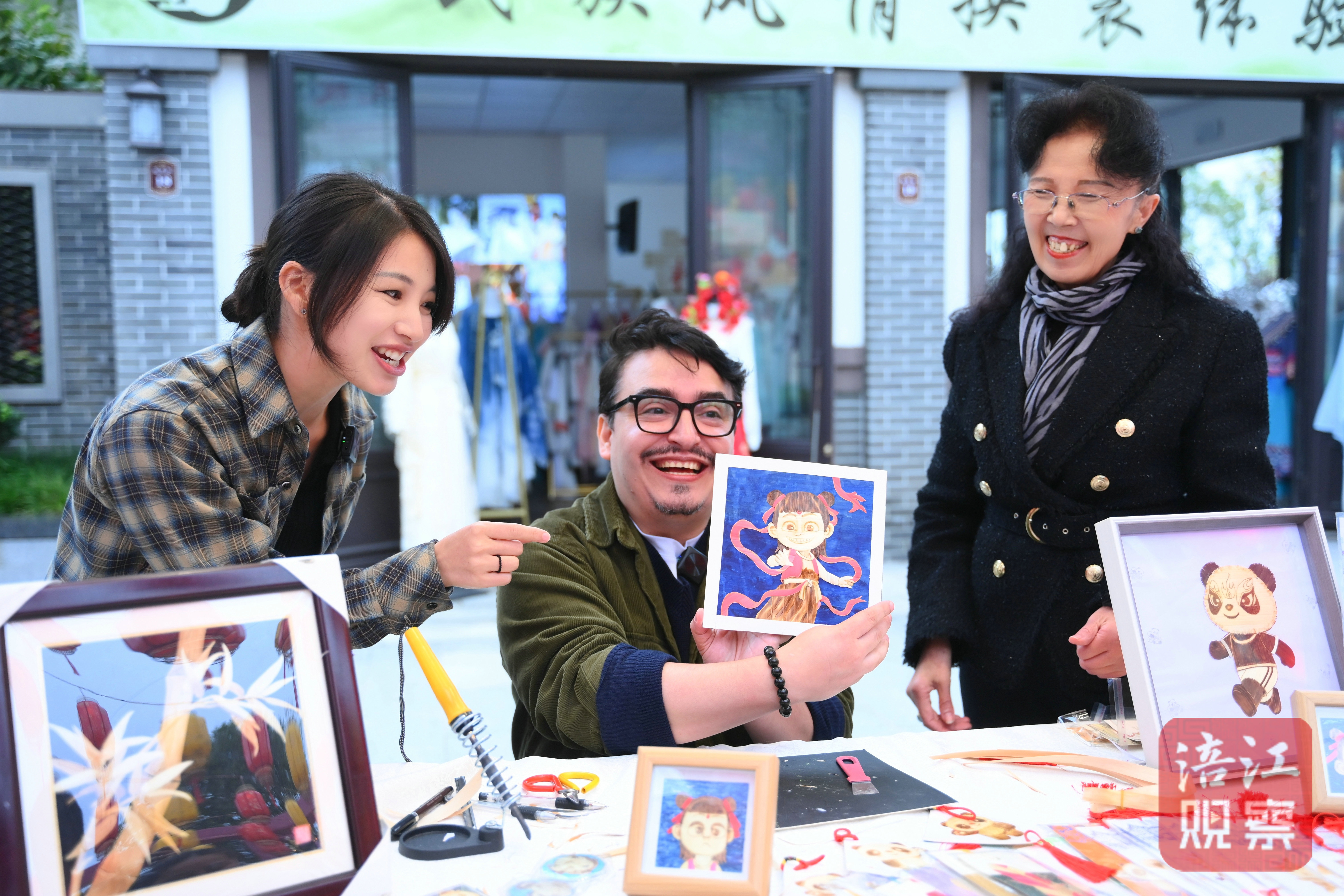 在市級非遺項目三臺麥稈烙畫的攤位,中國美術(shù)學(xué)院的學(xué)生肖慧元,正在非遺傳承人龍怡珍的指導(dǎo)下,進(jìn)行該項目的體驗。刮薄了的麥稈條,根據(jù)基礎(chǔ)圖案,順著羽毛生長的紋路,使用刻刀等工具切割粘貼,再修剪成型,最后把握好力度、速度、溫度,用烙鐵來燙出顏色的深淺層次。