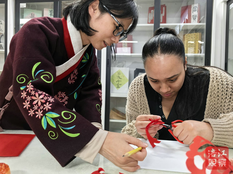 剪紙區(qū)里,非遺老師手握剪刀,寥寥數(shù)下便將一張彩紙變成靈動(dòng)月餅形狀的窗花,留學(xué)生們?cè)诶蠋煹慕淌谙?,指尖雖略顯生疏,但最終剪出了想要的圖案。新西蘭留學(xué)生特-拉哈納·佩塔·羅皮哈拿著自己的作品歡呼,興奮地向其他留學(xué)生“炫耀”。他興奮地說(shuō):“太神奇了!像魔術(shù)一樣!”