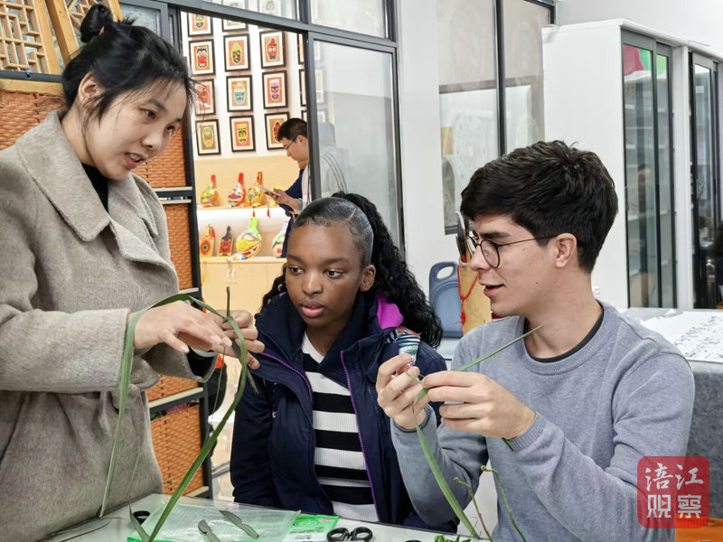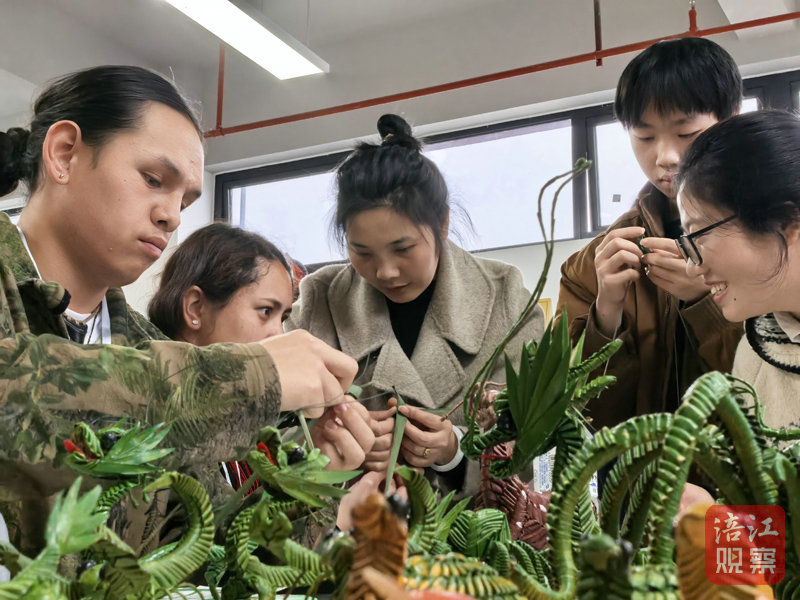 在草編區(qū),非遺傳承人黎覓現(xiàn)場(chǎng)展示技藝,一根根普通草絲在指尖纏繞、打結(jié),秒變惟妙惟肖小動(dòng)物,留學(xué)生們爭(zhēng)相討教,學(xué)得有模有樣。