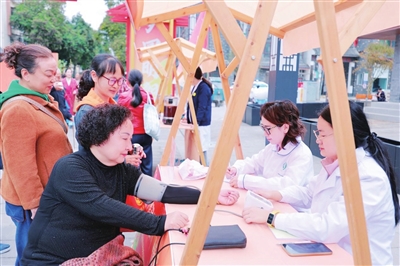 另一邊,活動現(xiàn)場設(shè)置的“蜀里銀齡·樂享美好”展示展銷區(qū)、“天府有禮”展區(qū)、適老體驗(yàn)區(qū),各種特色產(chǎn)品琳瑯滿目;“溫暖孝老區(qū)”,綿陽市中心醫(yī)院、綿陽市中醫(yī)院的義診臺前排起了長隊(duì),一句句叮囑,傳遞著醫(yī)者仁心;一旁的志愿服務(wù)點(diǎn)同樣忙碌,免費(fèi)理發(fā)等便民服務(wù),讓老人們臉上洋溢著幸福的笑容。