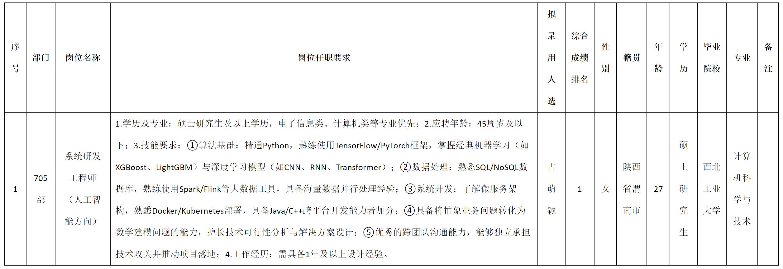 根據(jù)四川九洲電器集團有限責任公司發(fā)布的招聘公告及招聘相關規(guī)定,經測試、考察、體檢等程序,擬錄用占萌穎同志到四川九洲電器集團有限責任公司工作,現(xiàn)予以公示,具體情況如下: