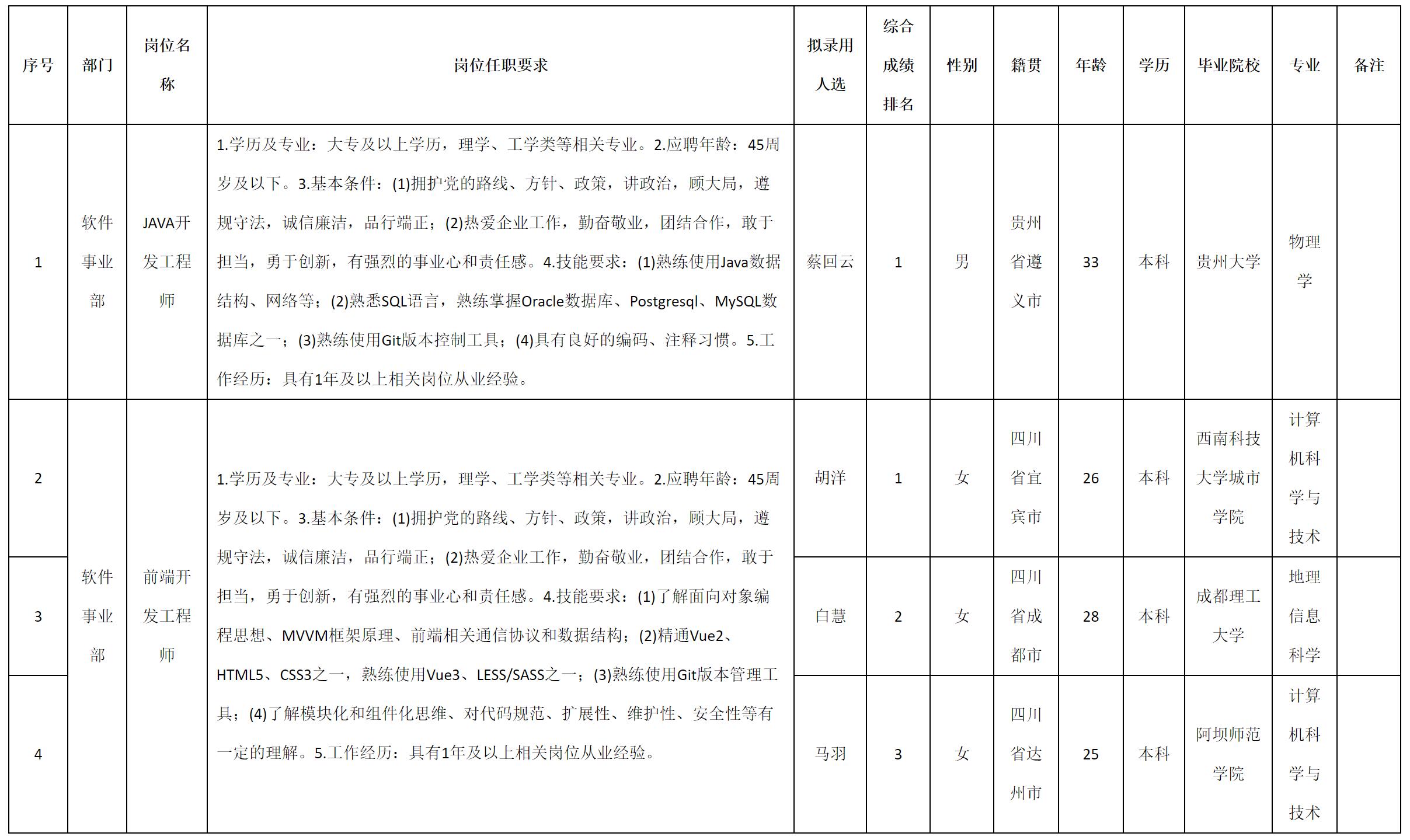 根據(jù)四川九強通信科技有限公司發(fā)布的招聘公告及招聘相關(guān)規(guī)定,經(jīng)測試、考察、體檢等程序,擬錄用蔡回云等4名同志到四川九強通信科技有限公司工作,現(xiàn)予以公示,具體情況如下: