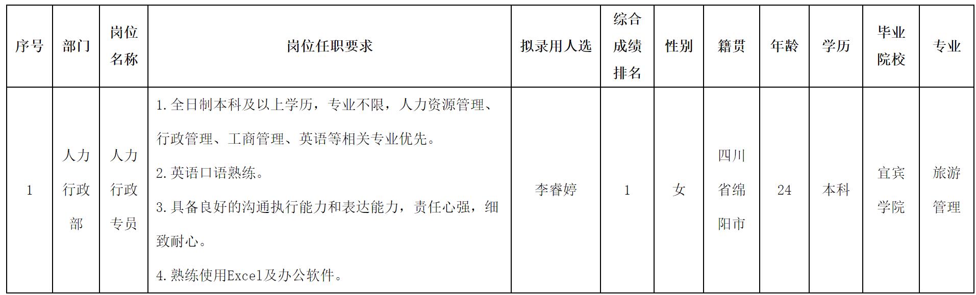 根據(jù)四川波鴻實(shí)業(yè)有限公司發(fā)布的招聘公告及招聘相關(guān)規(guī)定,經(jīng)面試、體檢等程序,擬錄用李睿婷同志到威斯卡特(綿陽(yáng))汽車零部件制造有限公司工作,現(xiàn)予以公示,具體情況如下: