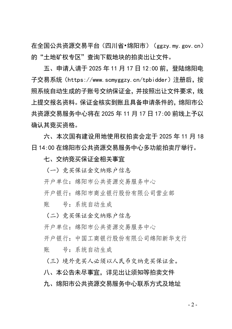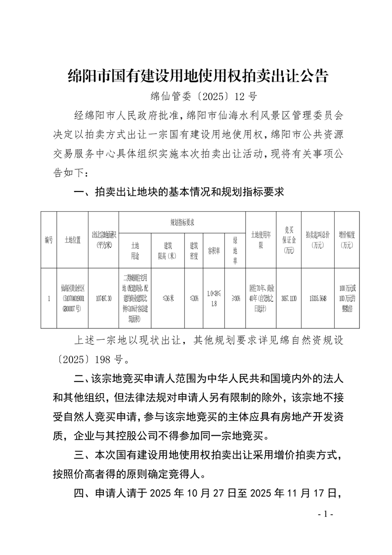 綿陽(yáng)市國(guó)有建設(shè)用地使用權(quán)拍賣(mài)出讓公告(綿仙管委〔2025〕12號(hào))