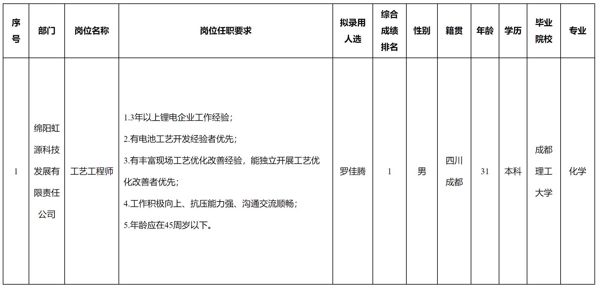 根據(jù)綿陽虹源科技發(fā)展有限責(zé)任公司發(fā)布的招聘公告及招聘相關(guān)規(guī)定,經(jīng)面試、考察、體檢等程序,擬錄用羅佳騰同志到我司工作,現(xiàn)予以公示,具體情況如下: