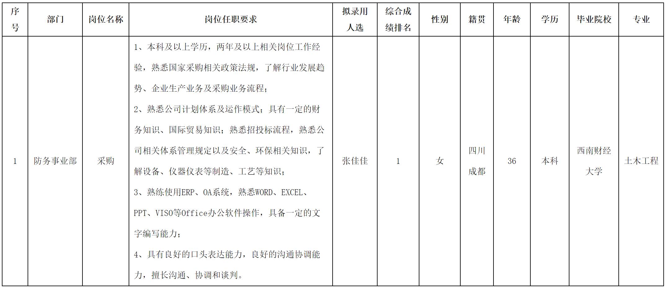 根據(jù)四川華豐科技股份有限公司發(fā)布的招聘公告及招聘相關(guān)規(guī)定,經(jīng)面試、考察、體檢等程序,擬錄用張佳佳同志到四川華豐科技股份有限公司工作,現(xiàn)予以公示,具體情況如下: