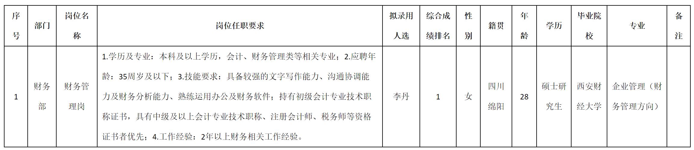 根據(jù)四川九洲電器股份有限公司發(fā)布的招聘公告及招聘相關規(guī)定,經(jīng)測試、考察、體檢等程序,擬錄用李丹同志到四川九洲電器股份有限公司工作,現(xiàn)予以公示,具體情況如下: