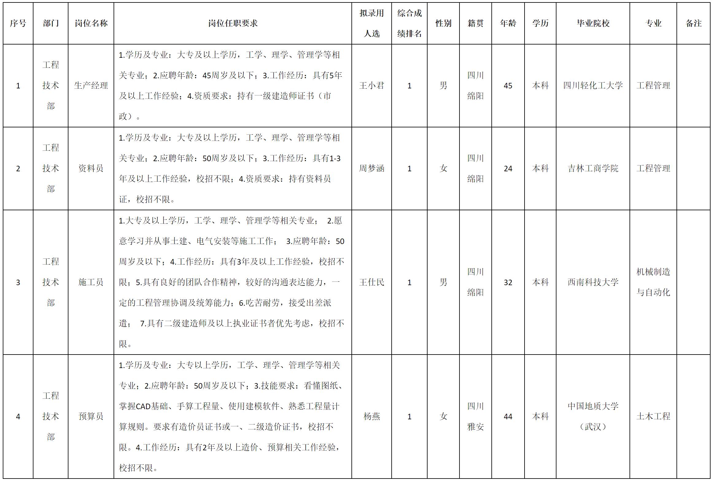 根據(jù)四川九洲建筑工程有限責(zé)任公司發(fā)布的招聘公告及招聘相關(guān)規(guī)定,經(jīng)測(cè)試、考察、體檢等程序,擬錄用王小君等4名同志到四川九洲建筑工程有限責(zé)任公司工作,現(xiàn)予以公示,具體情況如下:
