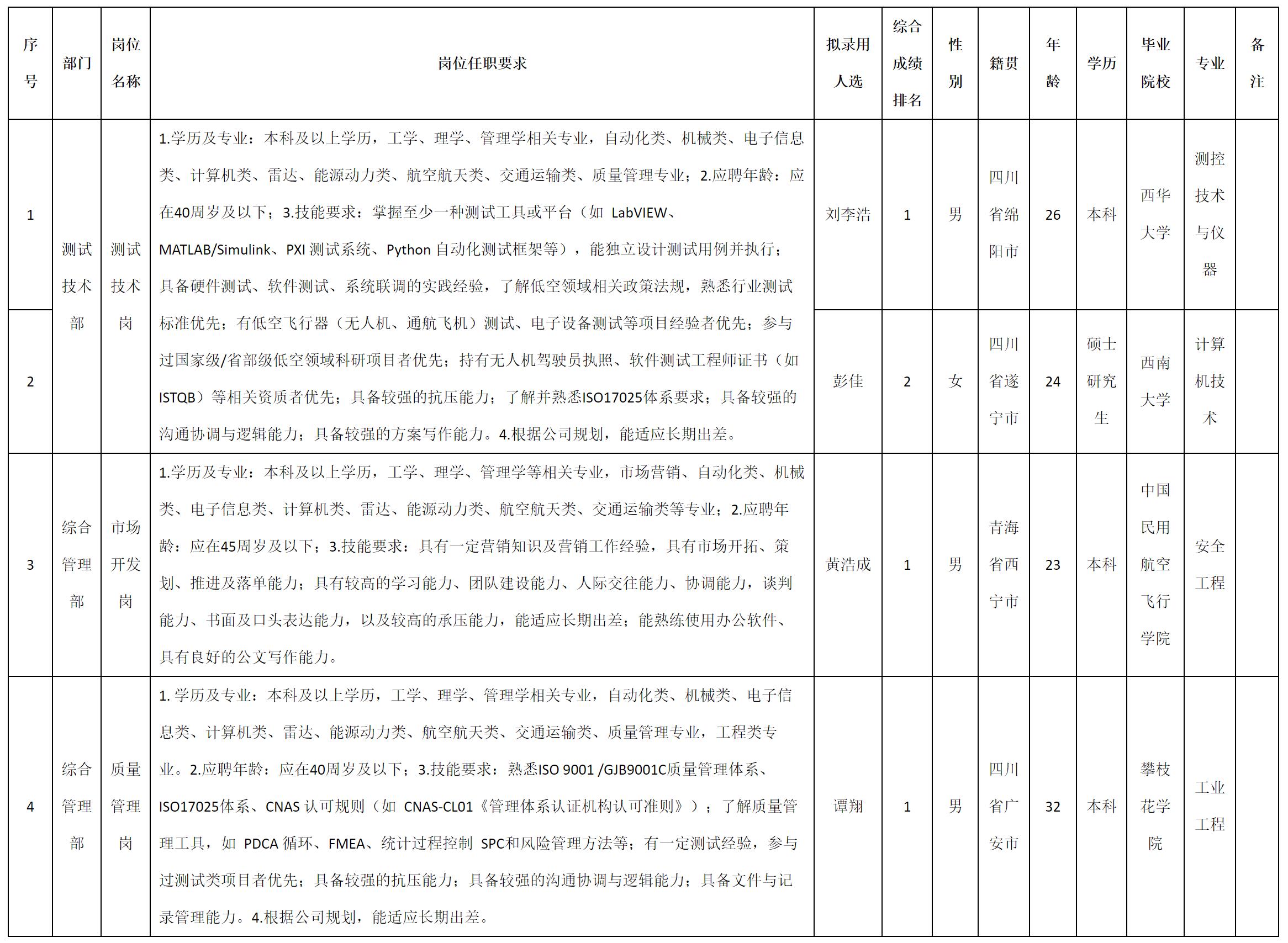 根據四川九洲永昌檢測技術服務有限責任公司發(fā)布的招聘公告及招聘相關規(guī)定,經測試、考察、體檢等程序,擬錄用劉李浩等4名同志到四川九洲永昌檢測技術服務有限責任公司工作,現予以公示,具體情況如下: