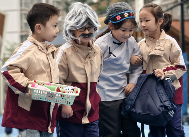 升旗儀式上,伴隨著嘹亮的國歌,五星紅旗在晨光中冉冉升起。孩子們身著整齊服裝,挺直小身板,目光緊緊追隨著國旗,將對祖國的敬意與對長輩的感恩之情融入歌聲里。隨后,大三班幼兒帶來精彩的“敬老”主題展示,童謠《九月九》清脆動聽,孩子們邊唱邊模仿捶背、遞水等照顧長輩的動作;情景劇《當(dāng)你老了》溫情上演,稚嫩的表演把扶老人過馬路、幫長輩做家務(wù)等場景生動呈現(xiàn),讓“敬老”從抽象概念變?yōu)榭吹靡姷臏嘏袆印?/p>