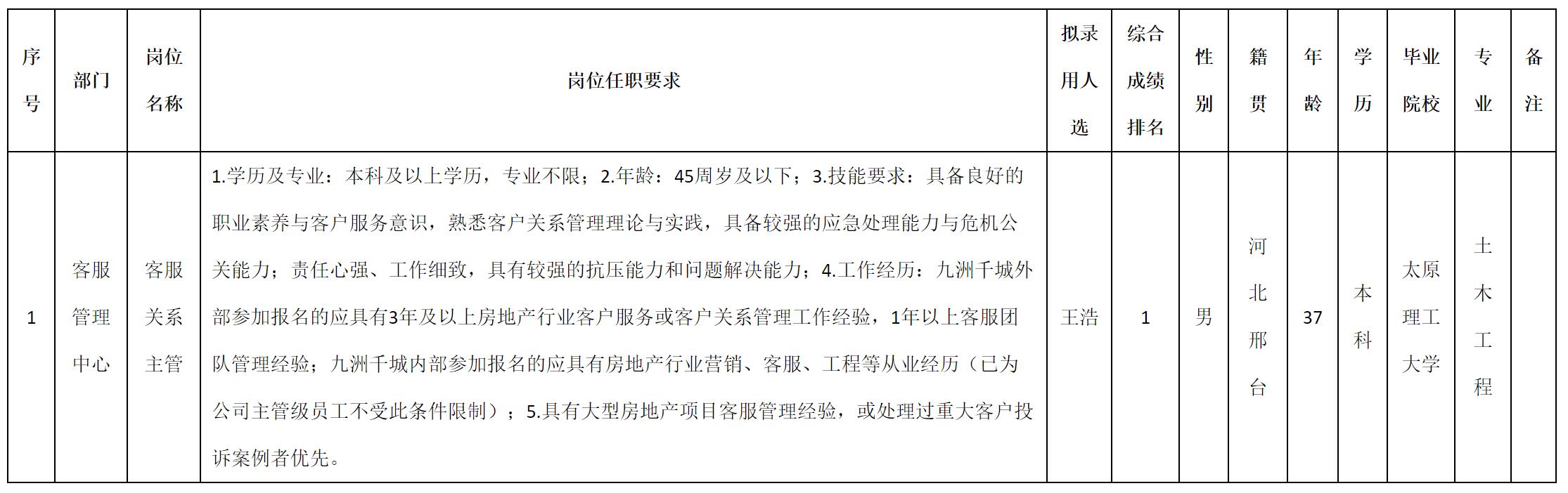 根據(jù)九洲千城置業(yè)有限責(zé)任公司發(fā)布的招聘公告及招聘相關(guān)規(guī)定,經(jīng)測試、考察、體檢等程序,擬錄用王浩同志到九洲千城置業(yè)有限責(zé)任公司工作,現(xiàn)予以公示,具體情況如下: