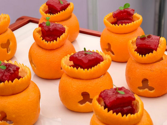 11月1日,第八屆世界川菜大會在四川樂山舉行。在2025世界川菜烹飪技能大賽現(xiàn)場,“橙香方肉”新鮮出爐。新華社記者邊思琪 攝