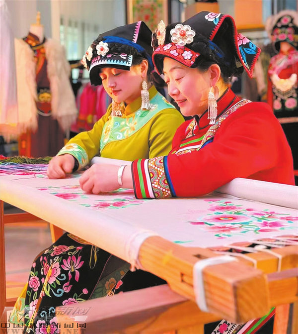 陳云珍(右)指導(dǎo)學(xué)員繡羌繡