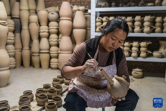 11月5日,村民在云南省曲靖市潦滸村的陶坊內(nèi)制作陶器。