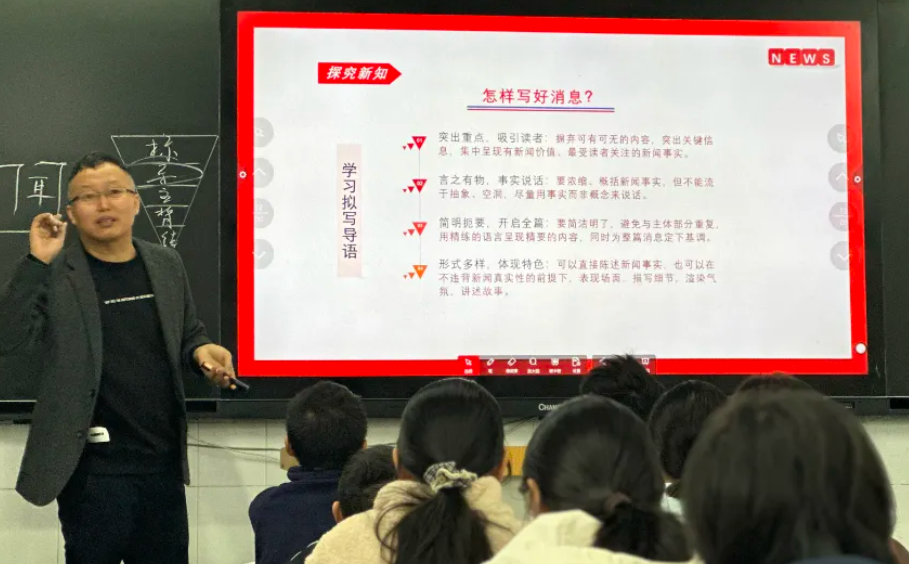 趙亮老師在八年級三班呈現(xiàn)了一堂結(jié)構(gòu)嚴謹、內(nèi)容充實的《新聞寫作》示范課。課堂環(huán)節(jié)緊湊,知識點層層遞進,學生積極參與討論,踴躍回答問題?,F(xiàn)場采訪聽課教師環(huán)節(jié)氣氛熱烈而有序,學生新聞寫作成果豐富多樣,佳作頻出,充分體現(xiàn)了學以致用的教學效果。