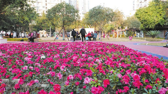 恒昌路口袋公園是該縣口袋公園建設(shè)的典型代表。該公園總面積約3700平方米,總投資140萬元,按照喬灌花草相結(jié)合的原則,用叢生多頭藍(lán)花楹、大型叢生垂絲海棠等異形喬木,結(jié)合組團(tuán)花境組成觀賞性較高的綠化景觀,同時(shí)鋪裝草皮、安裝汀步、添置休閑座椅,供市民休閑游賞。