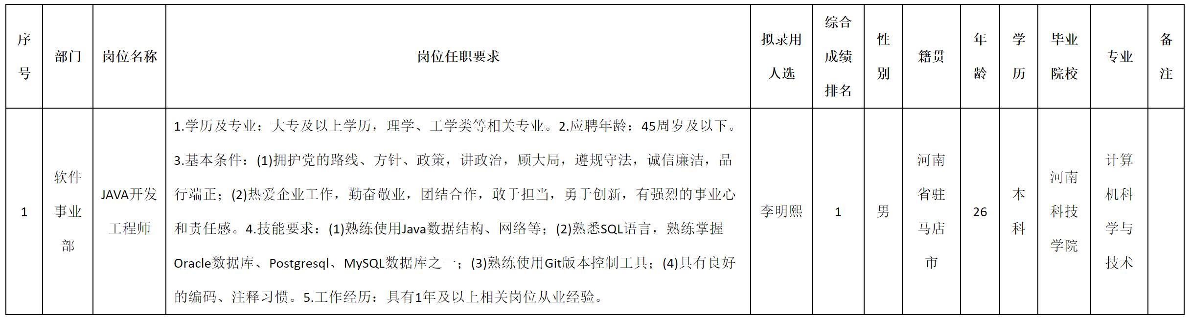 根據(jù)四川九強通信科技有限公司發(fā)布的招聘公告及招聘相關(guān)規(guī)定,經(jīng)測試、考察、體檢等程序,擬錄用李明熙同志到四川九強通信科技有限公司工作,現(xiàn)予以公示,具體情況如下: