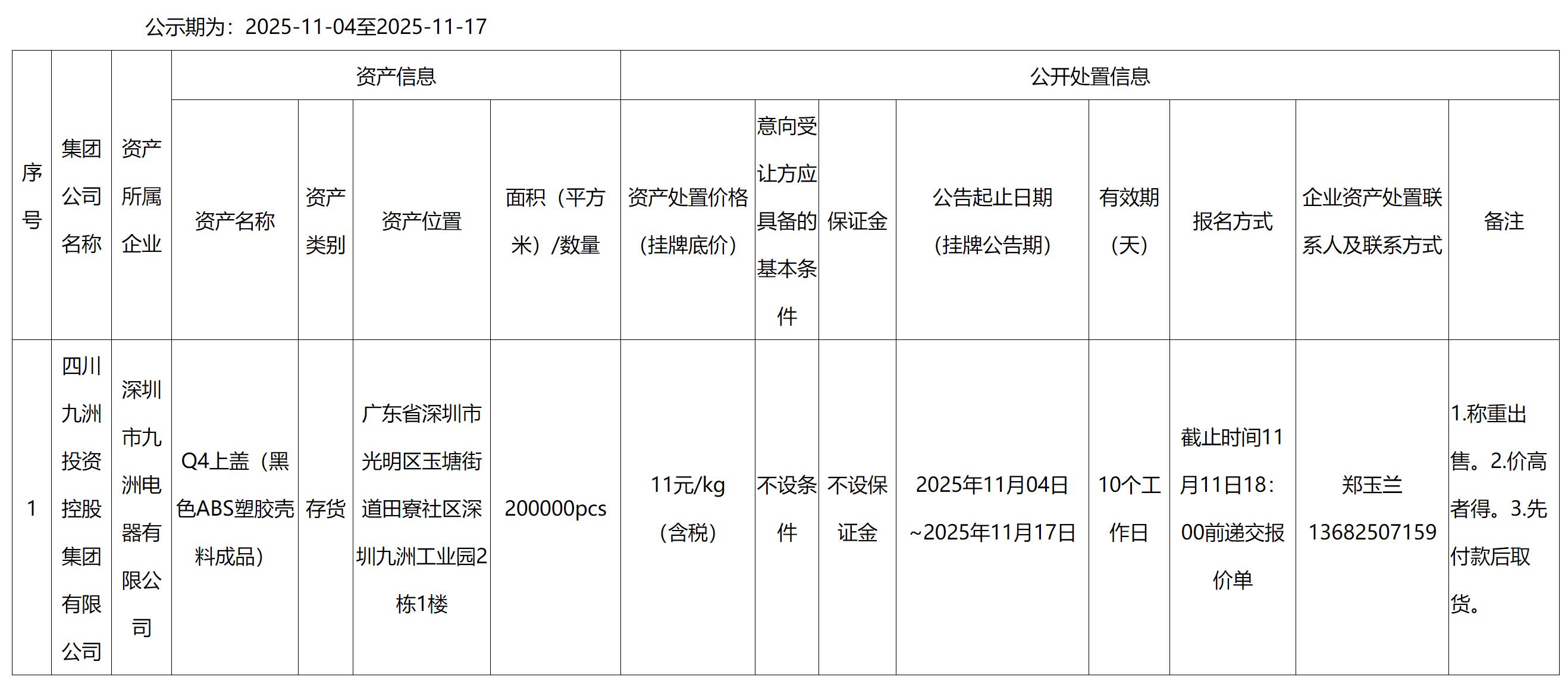 深圳市九洲電器有限公司資產(chǎn)處置公告