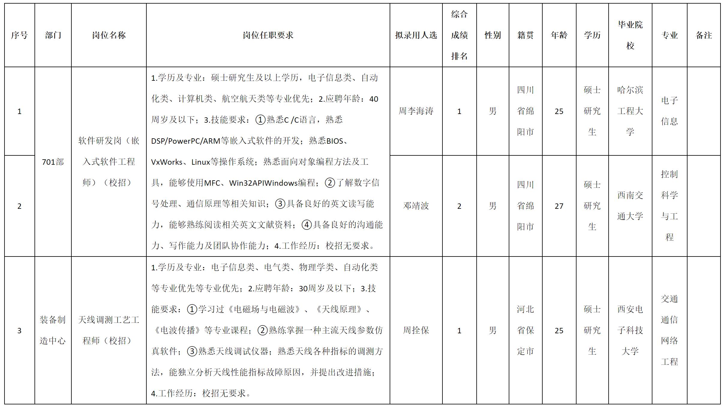 根據(jù)四川九洲電器集團(tuán)有限責(zé)任公司發(fā)布的招聘公告及招聘相關(guān)規(guī)定,經(jīng)測試、考察、體檢等程序,擬錄用周李海濤等3名同志到四川九洲電器集團(tuán)有限責(zé)任公司工作,現(xiàn)予以公示,具體情況如下: