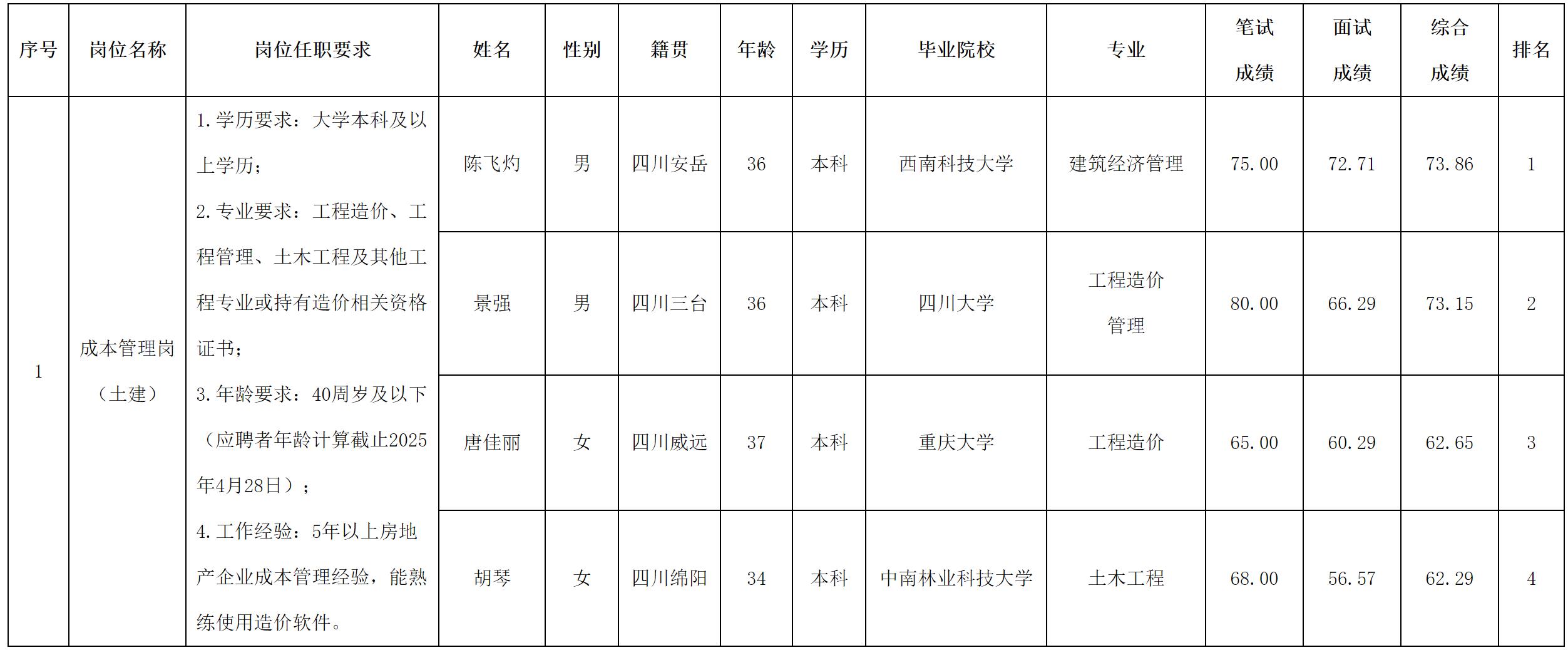 根據(jù)綿陽(yáng)市綿投置地有限公司發(fā)布的招聘公告及招聘相關(guān)規(guī)定,經(jīng)筆試、面試等程序,現(xiàn)將筆試、面試成績(jī)予以公示。