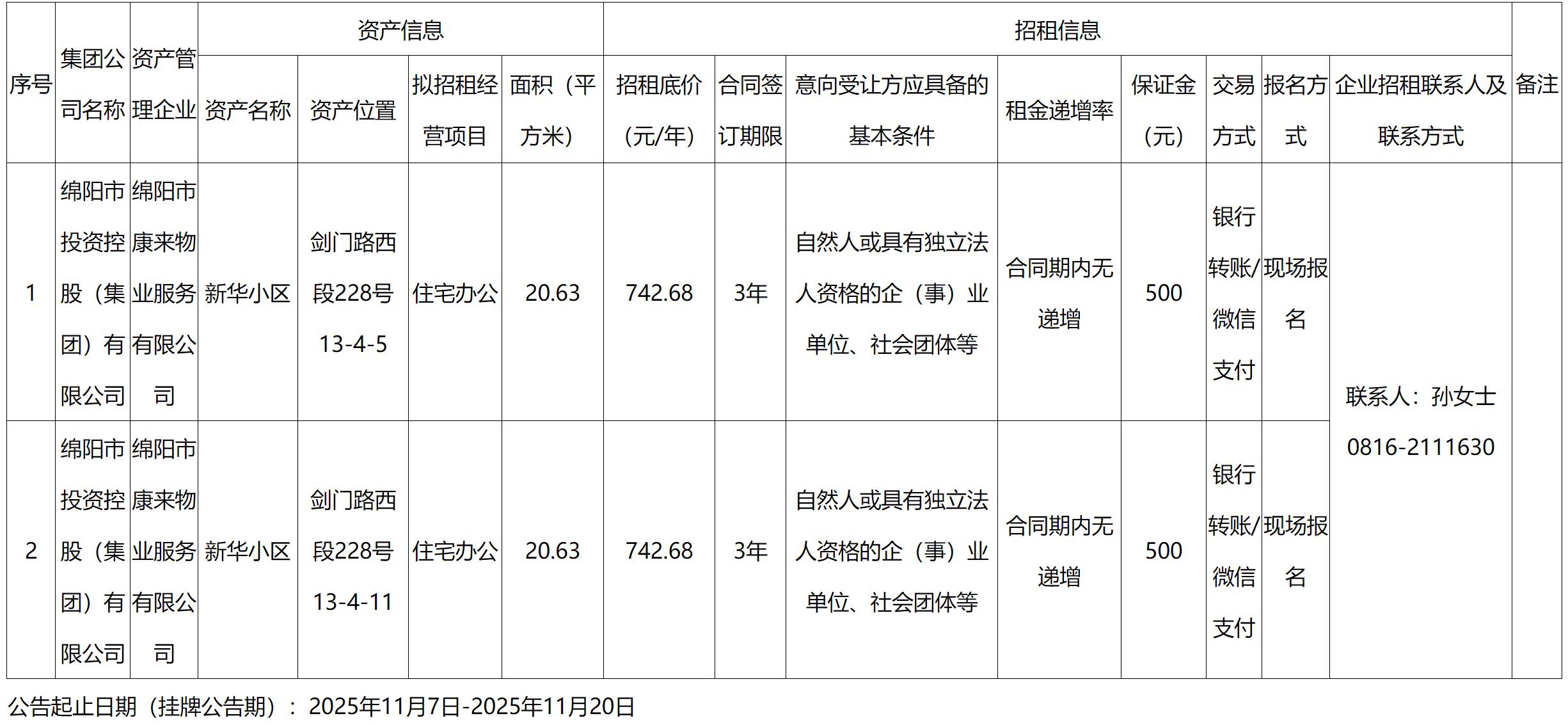綿陽(yáng)市康來(lái)物業(yè)服務(wù)有限公司資產(chǎn)出租公告