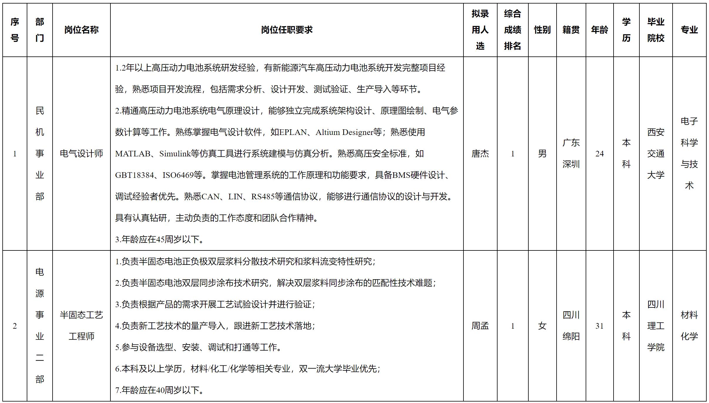 根據(jù)四川長虹電源股份有限公司發(fā)布的招聘公告及招聘相關規(guī)定,經(jīng)測試、考察、體檢等程序,擬錄用唐杰、周孟同志到我司工作,現(xiàn)予以公示,具體情況如下: